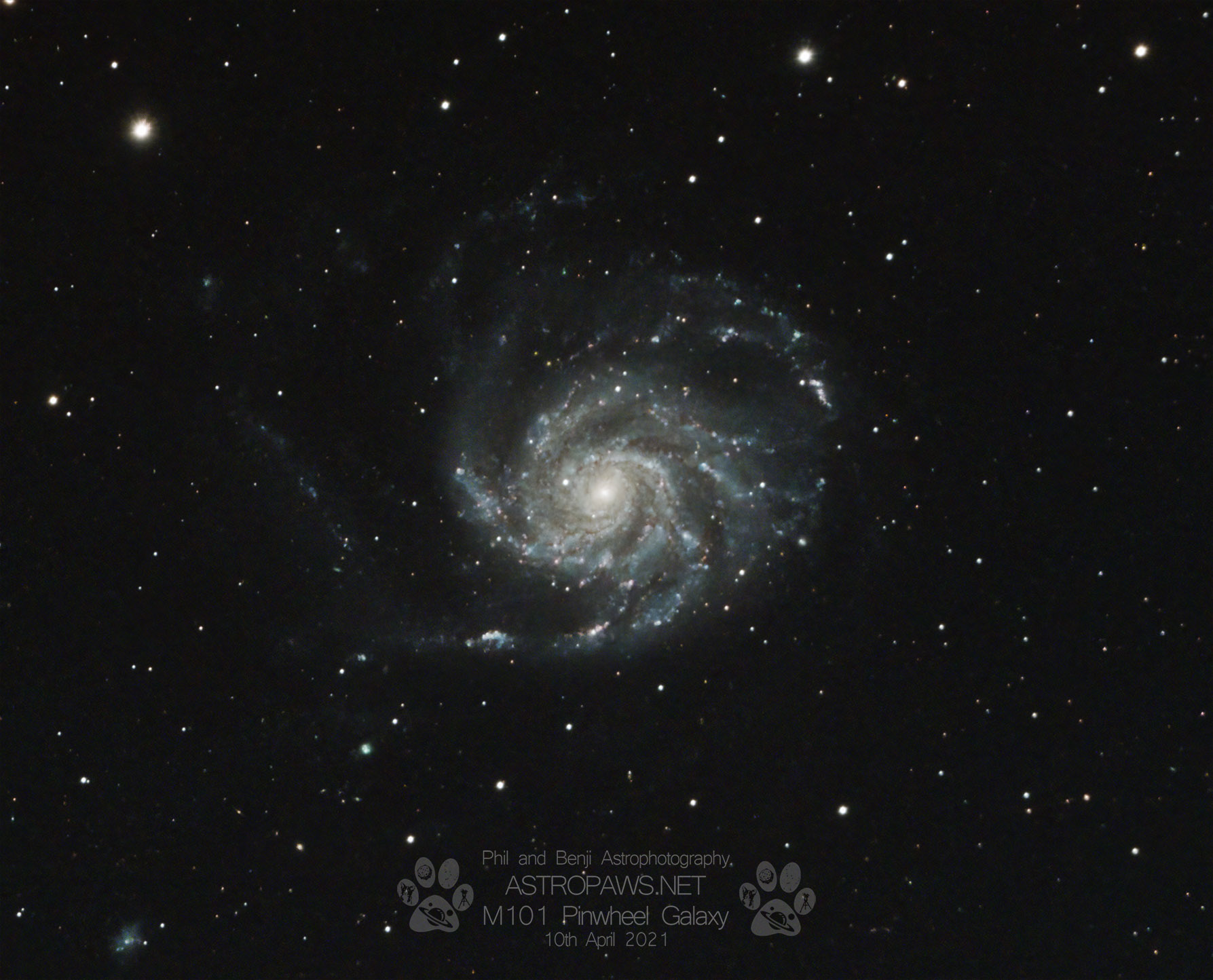 M101 is a large spiral galaxy that is approximately 21 million light years from earth and is almost twice the diameter of our own Milkyway Galaxy, coming in at around 170,000 light years across compared to the mere 100,000 light year diameter of the Milkyway. The arms of the Pinwheel galaxy are partly distorted and therefore not symmetrical due to interactions with companion galaxies. M101 also contains a large amount of HII regions which is home to some very intense star formation.