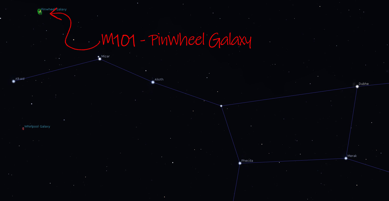 M101 is located in the constellation of Ursa Major. With many people being farmiliar with the 'Big dipper' or 'Sauce pan' part of this constellation, M101 is located above the end of the 'Handle'.