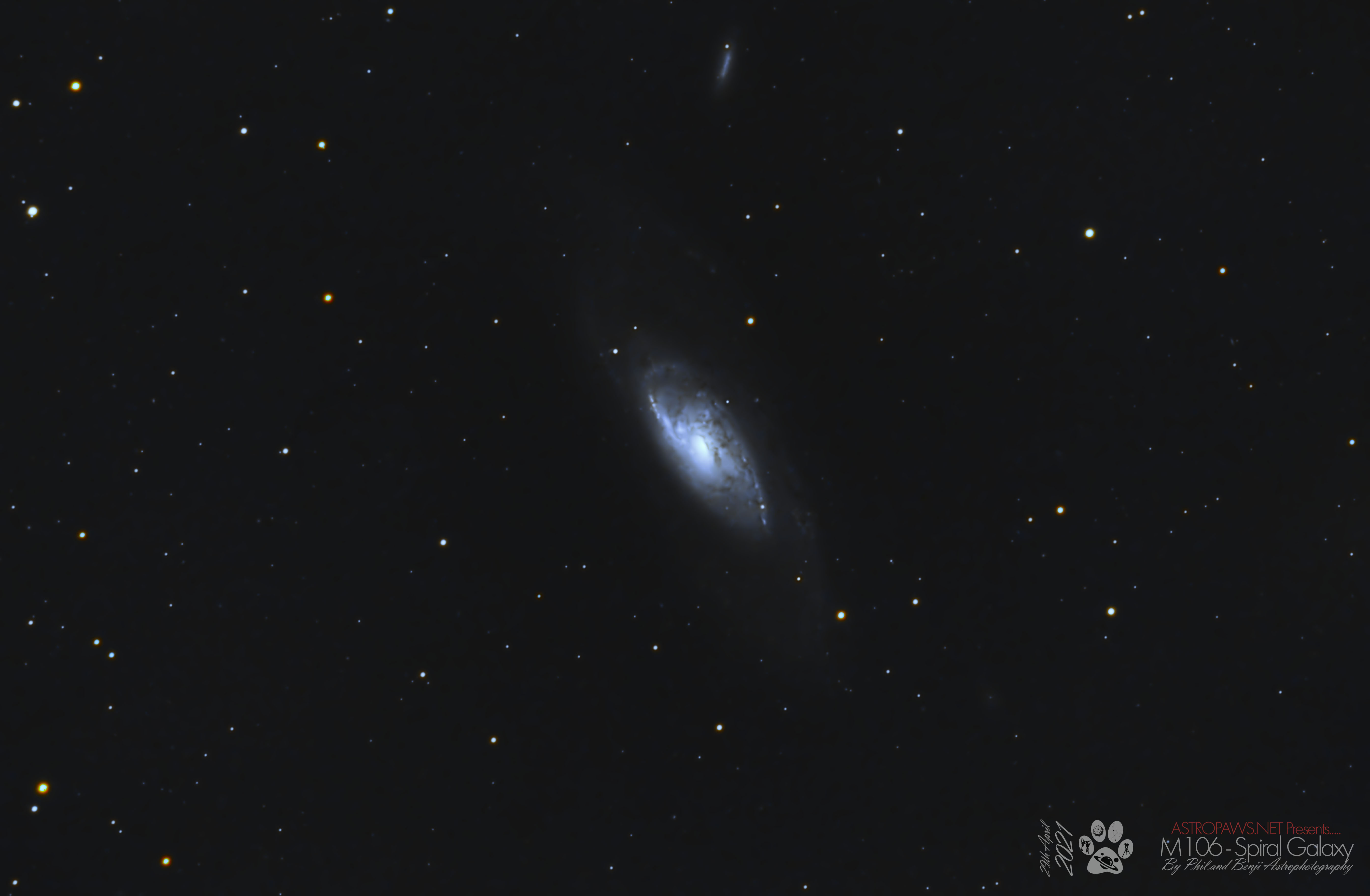 M106 is a an intermediate spiral galaxy similar in size to the andromeda galaxy but much further away at an approximate 24 million light years. It is around 135,000 light years in diameter.