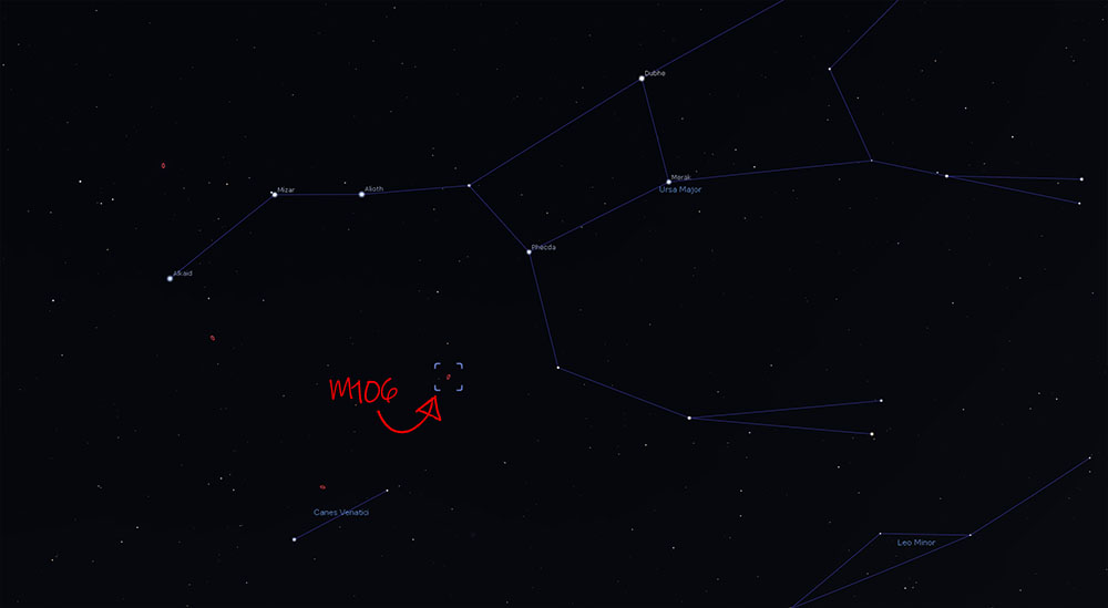 M106 is located in the constallation of Canes Venatici, close by to Ursa Major: