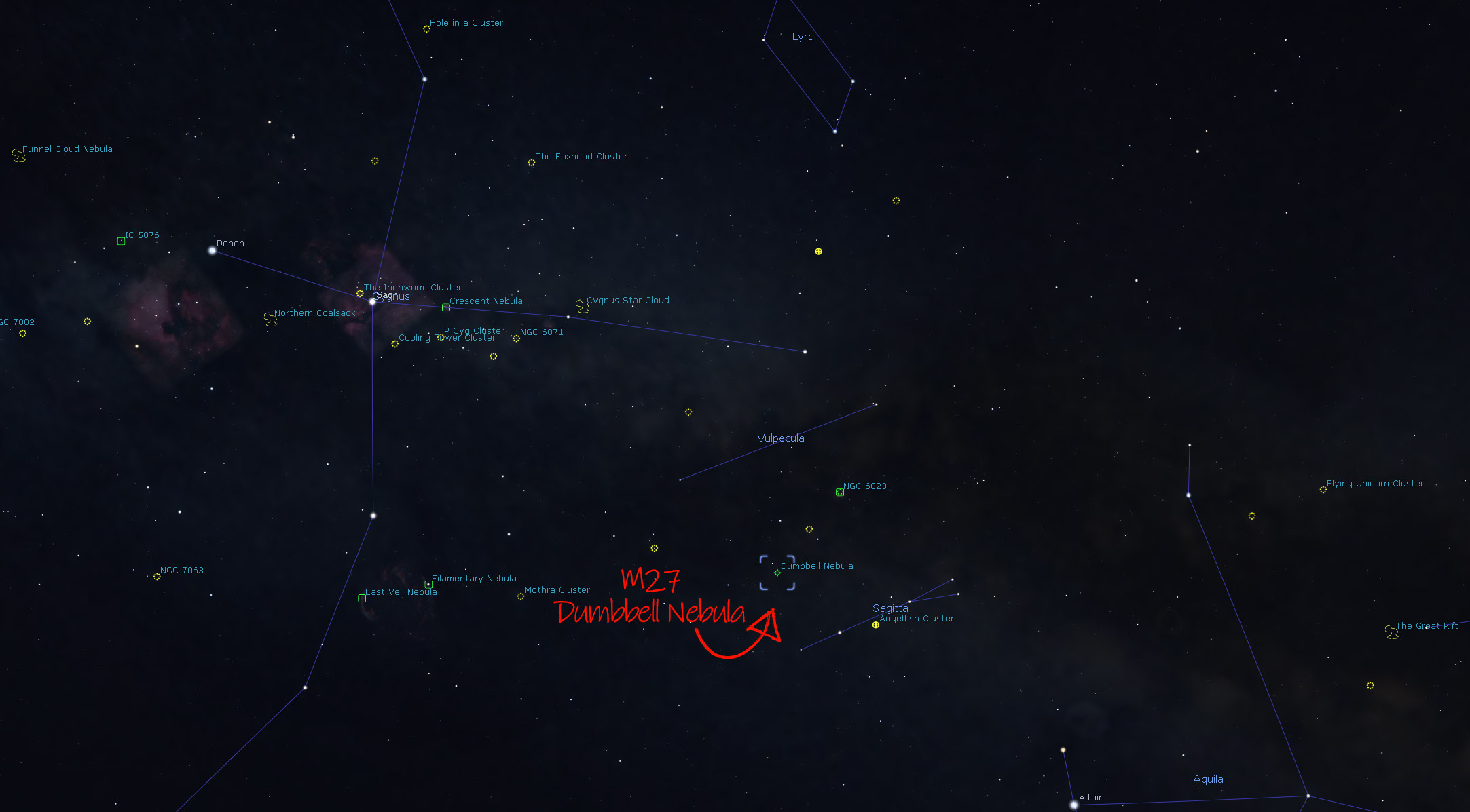 M27, the Dumbbell Nebula, is a planetary nebula surrounding a white dwarf star that shed it's outer layers and created the beautiful blue and red cloud of ionised gas. The nebula itself has a diameter of just 3 light years, that is less than the distance from the sun to our nearest star. It is found approximately 1360 light years from earth. It can be found in the constellation of Vulpecula, not far from Cygnus.