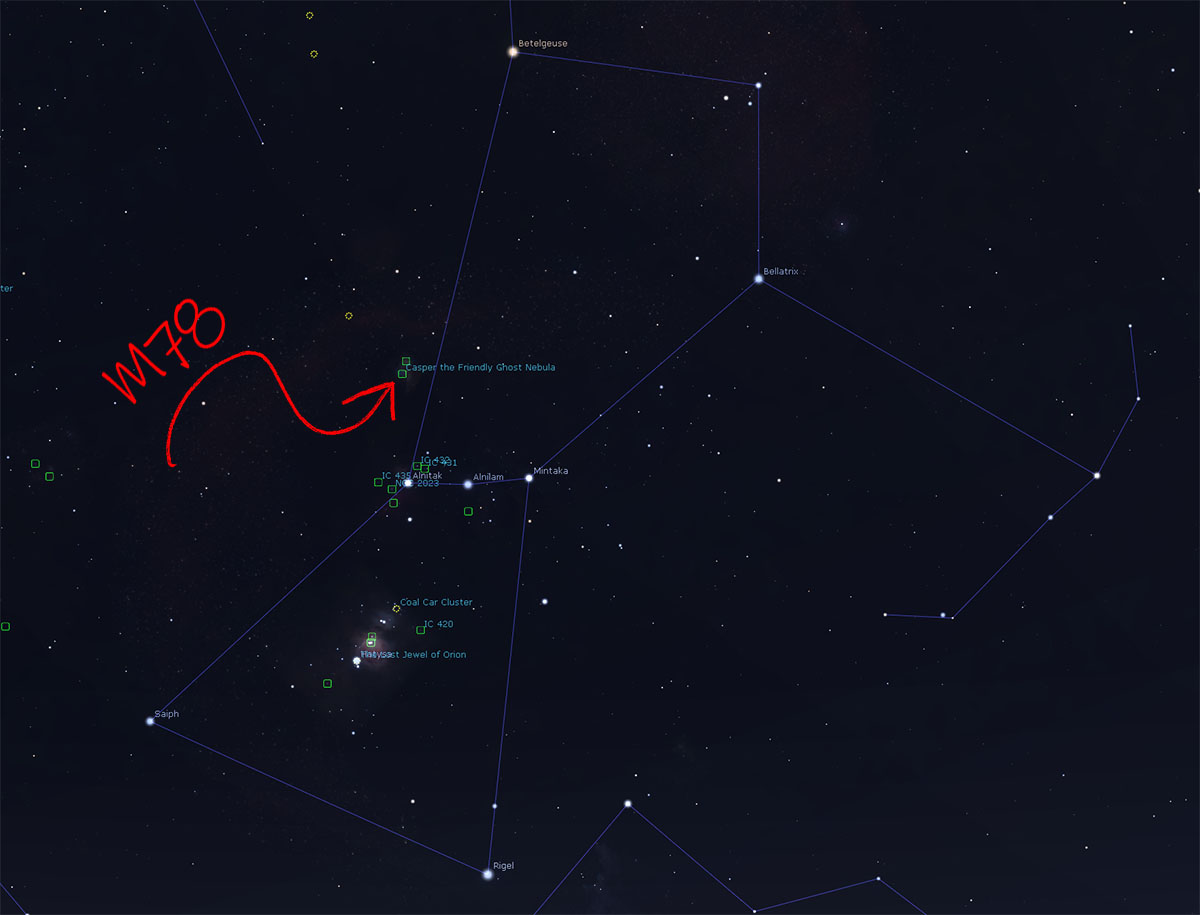 M78 is located in the constellation of Orion and can be found slightly above and to the left of Alnitak, the bottom left star of Orions Belt.