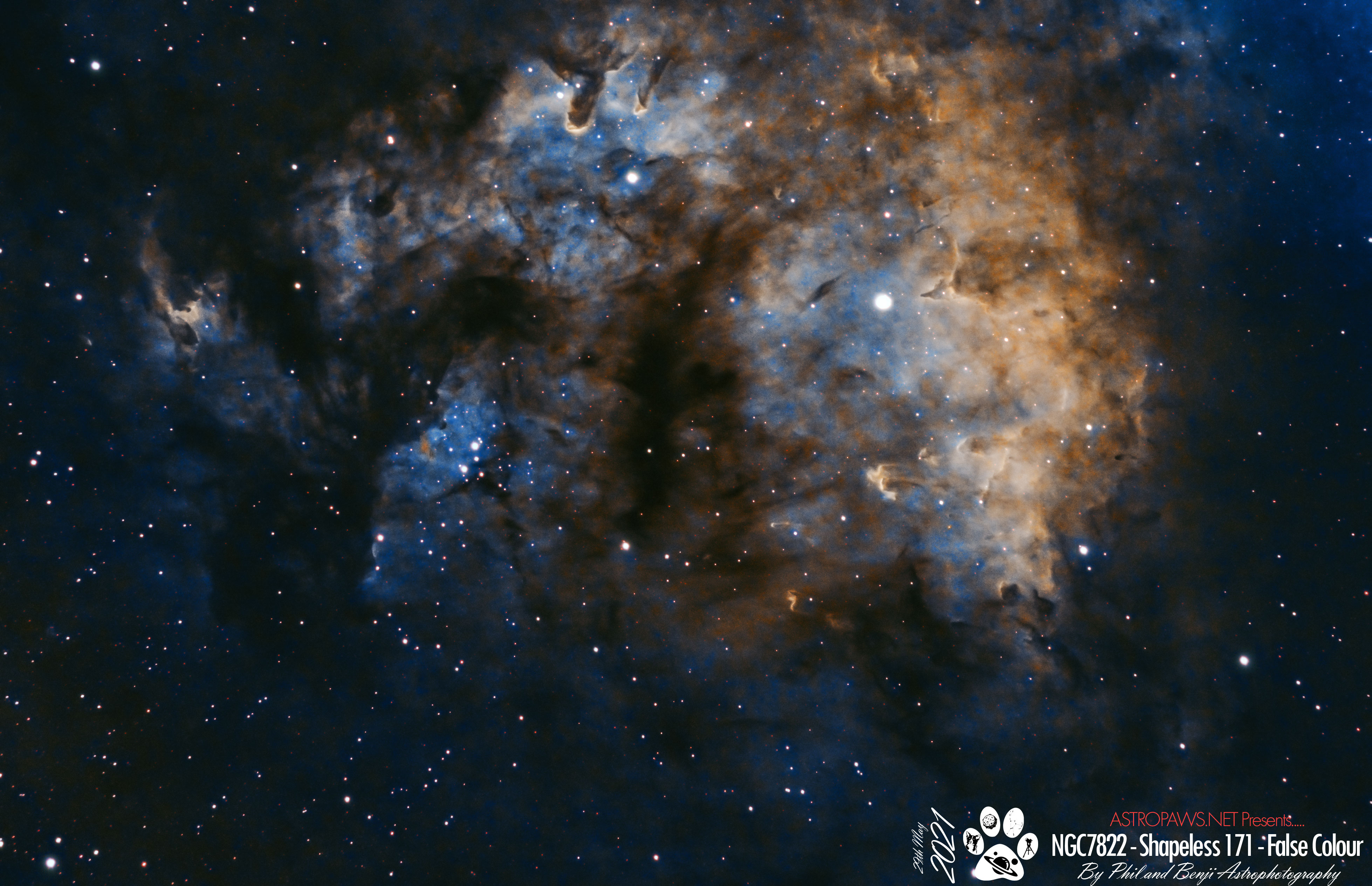NGC 7822 can be found right between the constellations of Cassiopeia and Cepheus, check the sky map below (click to expand), the small red box shows the section of the nebula imaged.