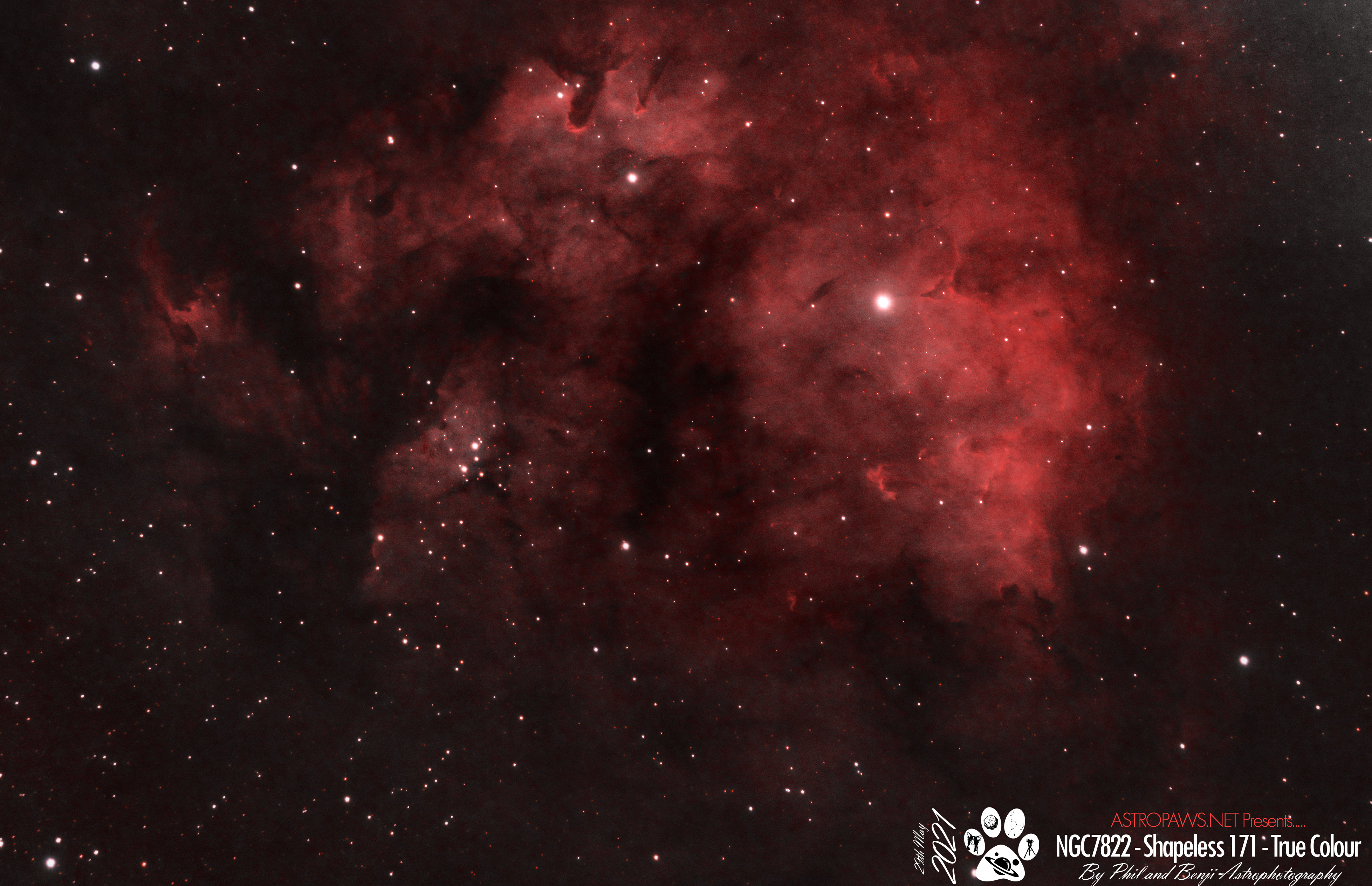 Update - 29th May 2021 - I finally got round to processing the various sessions of data that I had collected on this target and decided I had enough to create both a True colour version as well as a false colour version. This image is in the central portion of the NGC 7822 nebula, the who nebula extends well beyond this image and is about 4 times larger that this image alone. This image is taken specifically in the Hydrogen Alpha wavelength, in future sessions when I collect more data for the Oxygen and Sulphur I'll be able to create a wonderful full colour image. NGC7822 is an active star forming region contains a cluster of young stars known collectively as Berkeley 59 encompassed by a large emission nebula known as Shapeless 171. This is primarily a hydrogen emission nebula with a mix of other gases and dust. The dust creates some strikingly darker patches and filaments creating a visually interesting structure.