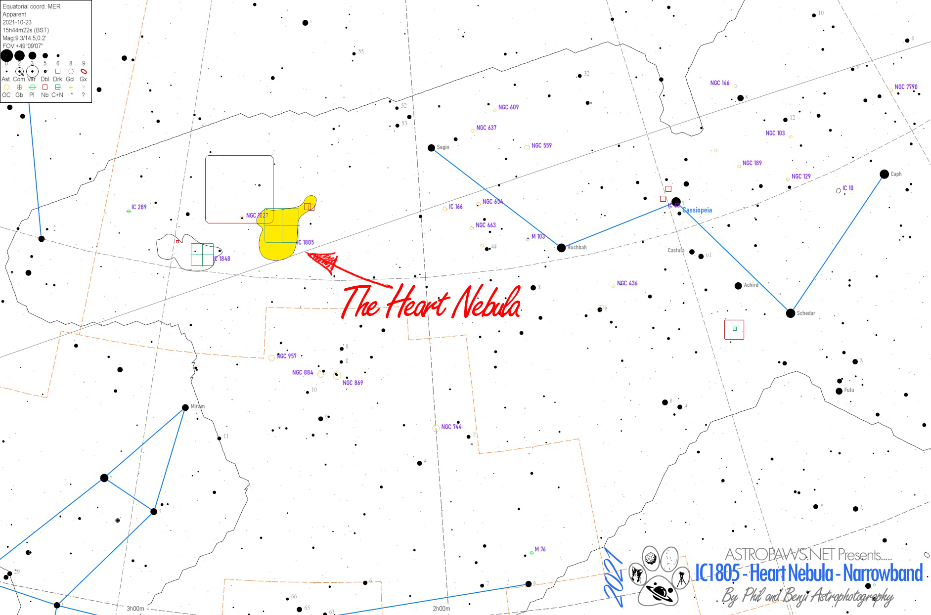 The heart nebula can be found in the constellation of Cassiopeia at a distance of around 7,500 light years from Earth. It is within the Perseus arm of our galaxy. It is a faint emission nebula with an apparent magnitude of 18.3 (That puts it at around 59,605 times fainter than what the human eye alone can see) At the centre of the heart nebula is a bright open star cluster, known as Merlotte 15, in amongst a twisted structure of gas and dust. This cluster contains many stars, with several being 50 x the mass of our own Sun. Also within the image in the upper right corner is the Fish Head Nebula, (IC1795) which is the brightest part of the overall Heart Nebula. The Fish Head Nebula is an intense region of star formation.