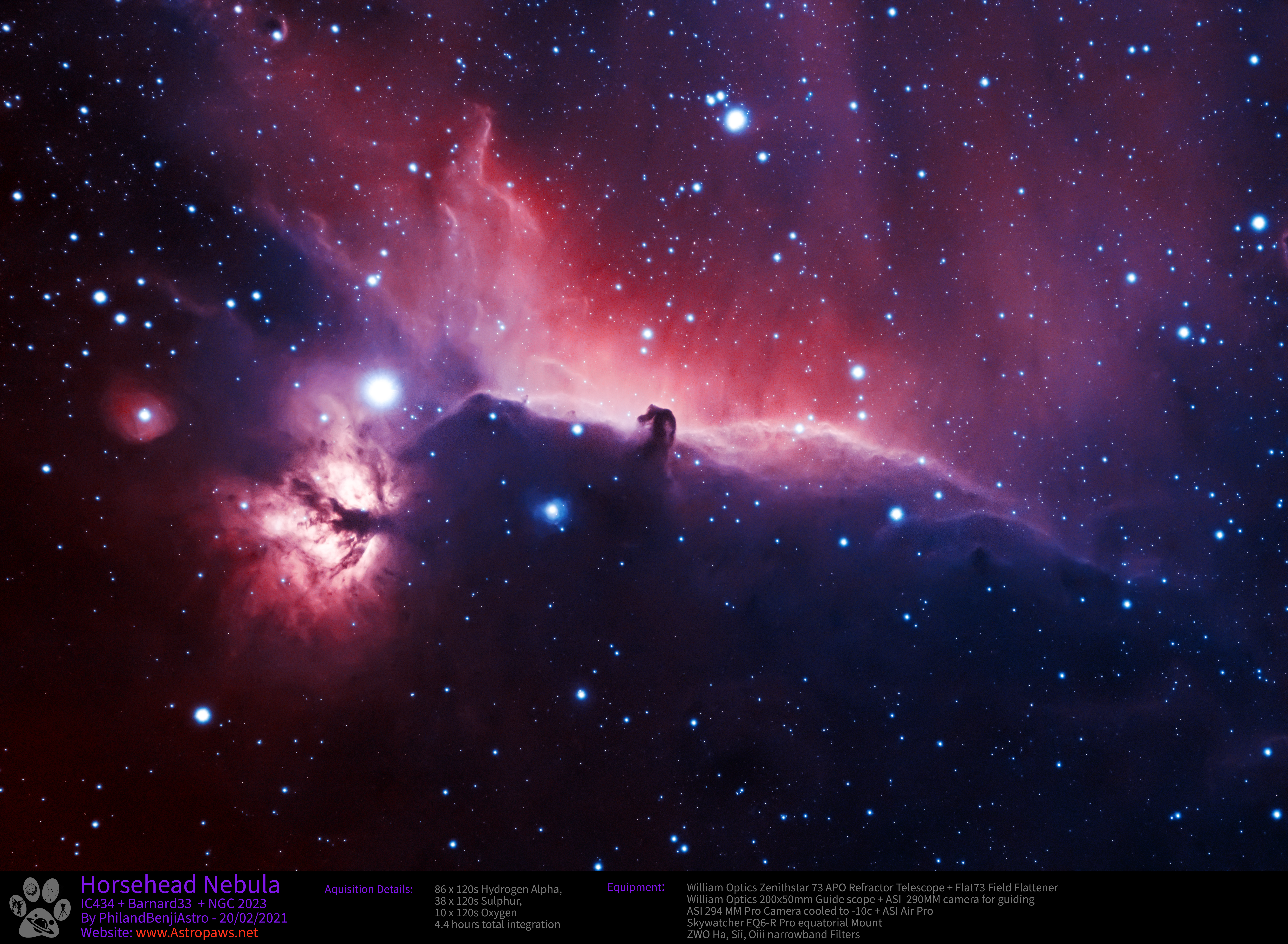 The Horsehead nebula (Barnard 33) and the Flame nebula (IC434) lie in the constellation of Orion right beside the third and lowest star of the three stars of Orions belt, this star is the bright class O star, Alnitak. To give a sense of scale, the dark cloud of the actual 'Horsehead' is 7 light years in diameter making the entire width of this image approx 210 light years across.